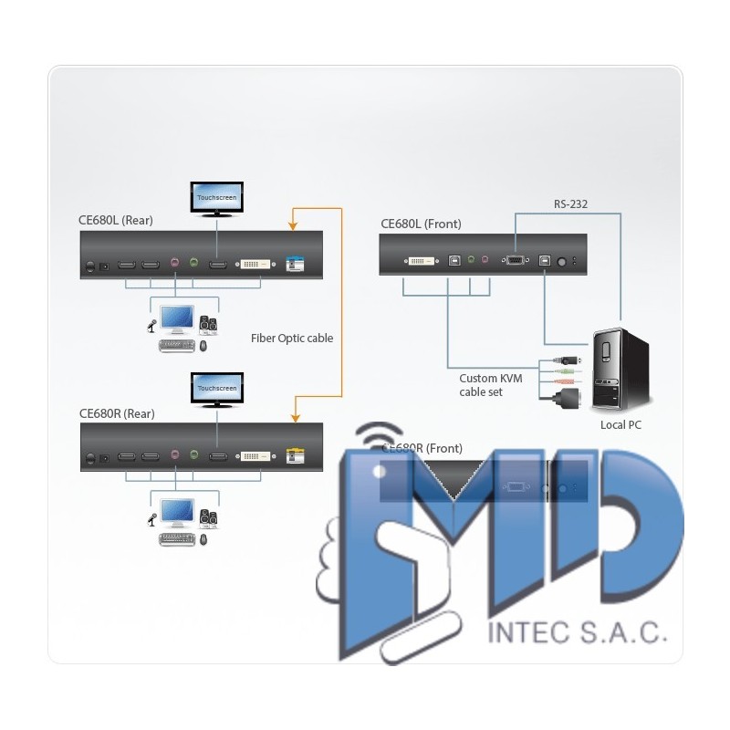 El CE680 ofrece acceso a una computadora tanto de la consola local como de la remota (teclado y mouse USB, monitor). Además, el CE680 utiliza la tecnología de fibra óptica más reciente para interconectar las unidades local y remota, resultando la instalación rápida y sencilla y ofreciendo una transmisión de las señales KVM DVI a larga distancia de hasta 600 m.