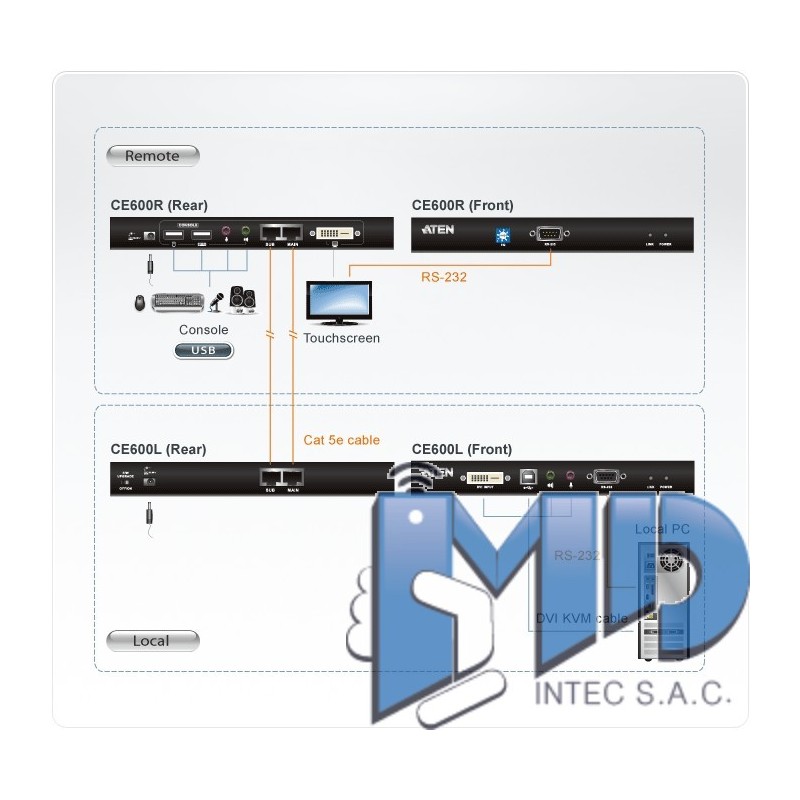 El CE600 es una extensión KVM para consolas USB y gráfica DVI con función serie RS-232. El equipo permite acceder a un sistema informático desde una consola remota (teclado y mouse USB y monitor). Dado que permite el acceso a una computadora desde una consola remota, el CE600 es la solución perfecta para toda instalación donde la consola tenga que estar ubicada en un lugar conveniente y accesible, pero con la premisa de instalar el equipo del sistema en sí en un lugar seguro – alejado del polvo y la suciedad de la planta de fabricación o de la influencia ambiental de una obra, por ejemplo. De esta manera, se pueden instalar sistemas muy distantes. El CE600 emplea un cable de Cat. 5e para transmitir señales gráficas (DVI Single Link) con resoluciones hasta 1920 x 1200*